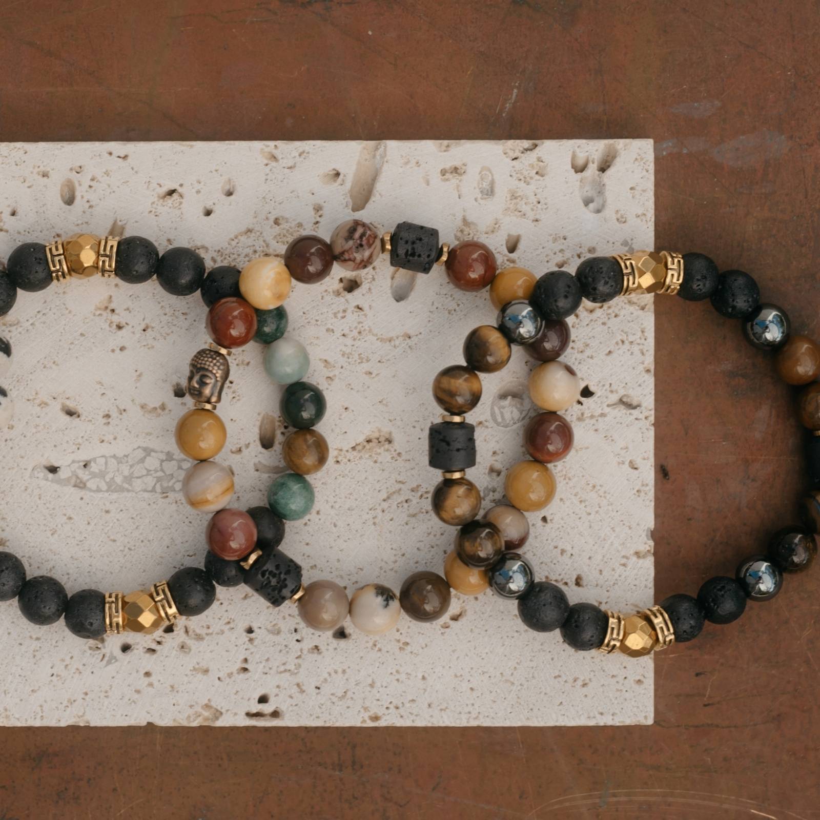 Męska bransoleta mocy stworzona z myślą o liderach, przedsiębiorcach i niezależnych mężczyznach, którzy pewnie kroczą własną ścieżką. To nie tylko elegancka biżuteria biznesowa, ale także amulet, ochrona i wsparcie energetyczne w realizacji ambitnych celów. Wyjątkowe połączenie Tygrysiego Oka, Hematytu i Lawy Wulkanicznej w otoczeniu złoconych dodatków tworzy potężną synergię, podkreślającą siłę, determinację i wewnętrzną stabilność.